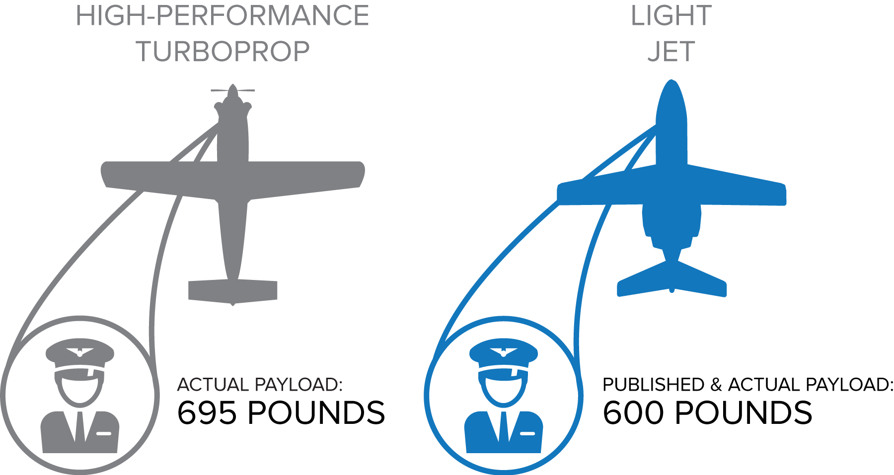 Take a turboprop that can lift 895 pounds with full fuel and an entry-level jet that can lift 600 pounds. With a couple questions to both manufacturers, you may find the jet payload includes the weight of a 200-pound pilot while the turboprop calculations don’t.